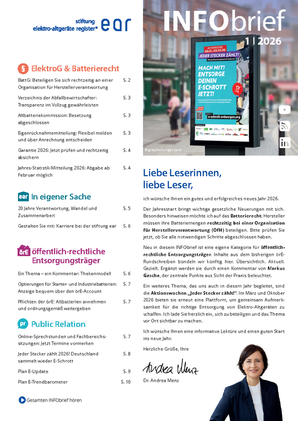 Der INFObrief der stiftung ear informiert vierteljährlich kurz und kompakt über wichtige Entwicklungen. So werden vor allem Hersteller, Bevollmächtigte, öffentlich-rechtliche Entsorgungsträger und Vertreiber, aber auch die interessierte Öffentlichkeit mit relevanten Informationen zu Neuerungen rund um das Batterierecht und das ElektroG versorgt.