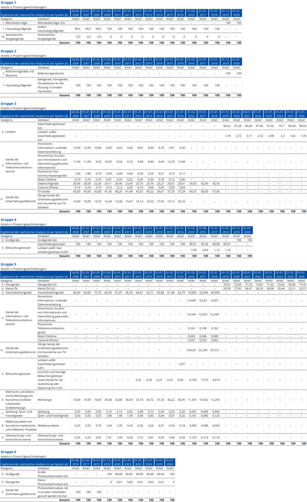The following overview shows the reported and – if necessary – estimated input amounts for the complete calendar year that are required by the Joint Enterprise for coordinating pick-ups for each type of equipment reported by the electrical and electronic equipment producers/ElektroG authorised representatives. The input amounts in such types of equipment which would allow a conclusion as to their identity due to the low amount of registered electrical and electronic equipment producers / ElektrG- authorised representatives are not shown in the display.